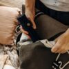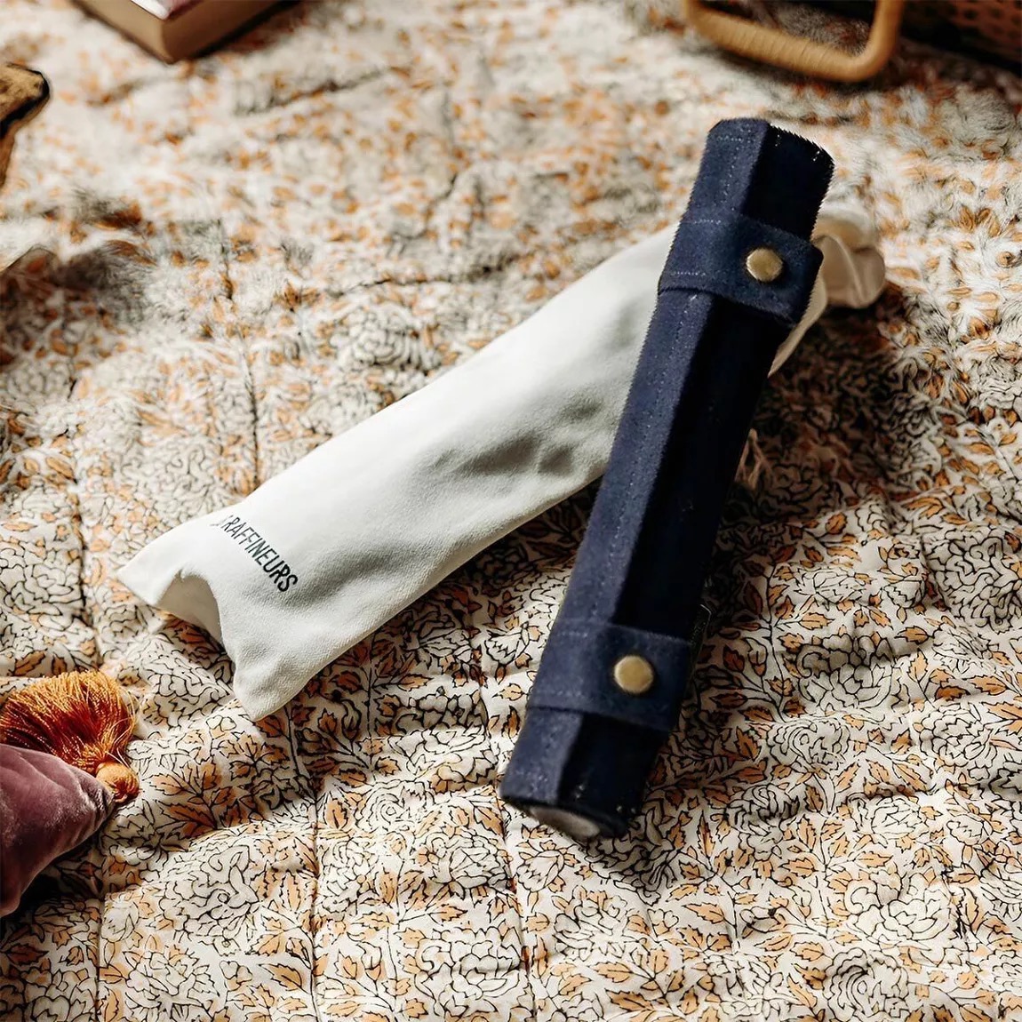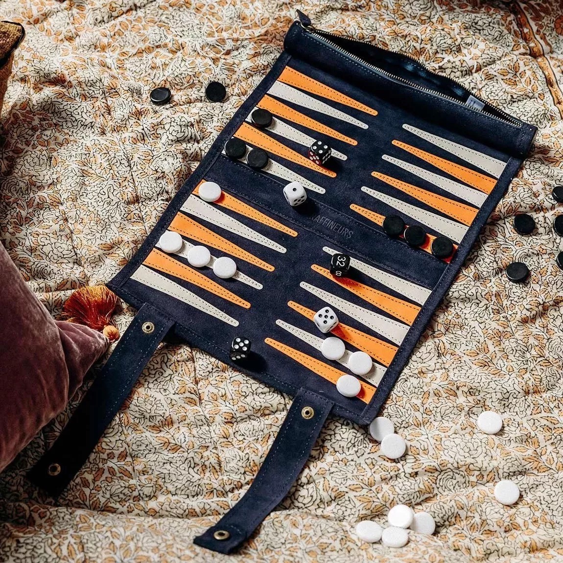 Un backgammon de voyage en velours et simili cuir pour jouer là où bon vous semble. Par Okuri, la collection d’objets pour faire battre les cœurs signée Les Raffineurs.