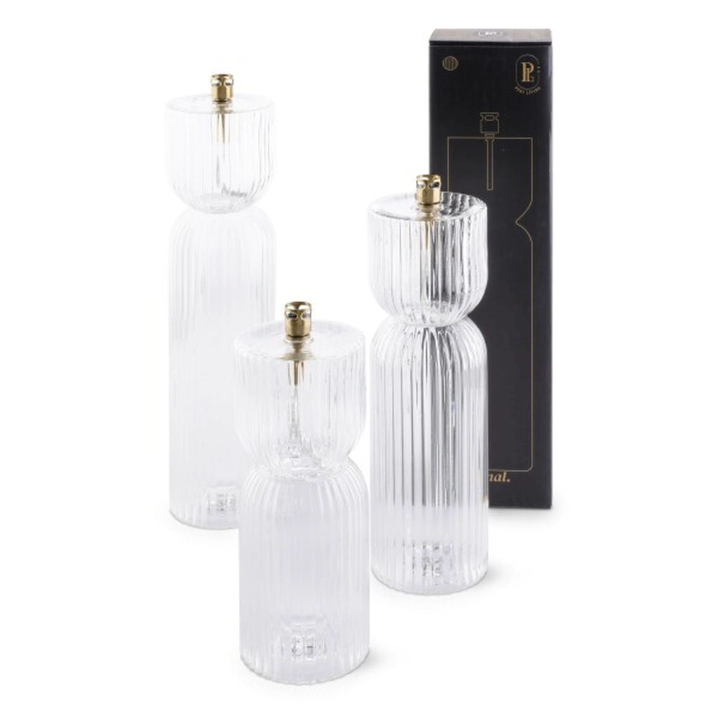 Lampe à huile Ribelle Clear Brass est une lampe raffinée en verre transparent à motif côtelé discret et dotée d’un porte-mèche couleur laiton. Cette combinaison lui confère une allure à la fois moderne et intemporelle, empreinte de luxe.