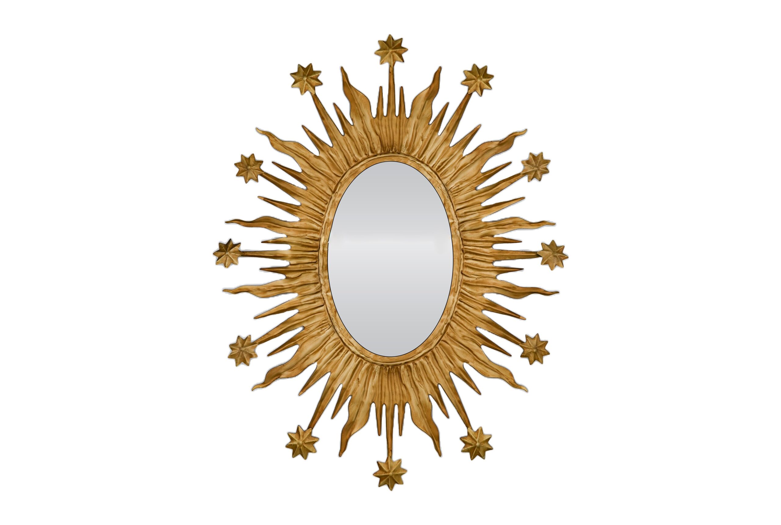 Véritable pièce maîtresse, le miroir Galilée illumine l’espace et capte tous les regards. Inspiré des symboles sacrés et baroques, il associe la puissance du soleil à la délicatesse de détails finement sculptés, ponctués d’étoiles rayonnantes.