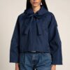 Ce mini trench revisite cet intemporel avec une silhouette courte et sophistiquée. Son allure preppy chic est sublimée par un détail unique : une capuche amovible qui peut se nouer délicatement autour du cou ou être portée comme une cravate élégante pour une touche de raffinement supplémentaire.